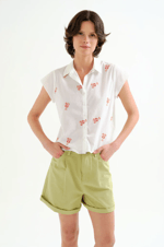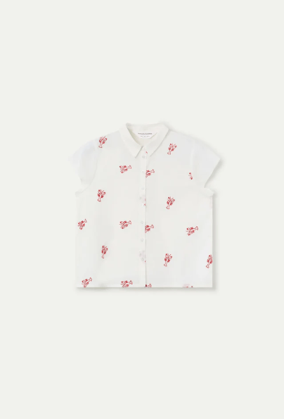 100% cotton shirt with red lobster embroidery. Lapel collar and short sleeves. White button-front closure. The model is 177 cm tall and wears size S.