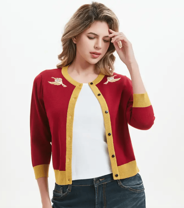 Owls in Deep Red color with a shorter body length and original artwork by Sweven Print Design. This soft sweater knit has fantastic stretch! Embroidered designs on front and back, button-up front, contrast v-neckline, 3/4 sleeves with contrast cuffs, and a contrast bottom hem. The model is 5 ft. 6 in., 35-25-37, and is wearing size S/M.