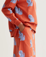 Orange 100% cotton skirt with blue dog print. High-waisted elasticated fixed waistband. Side pockets. The model is 173 cm tall and wears size S.