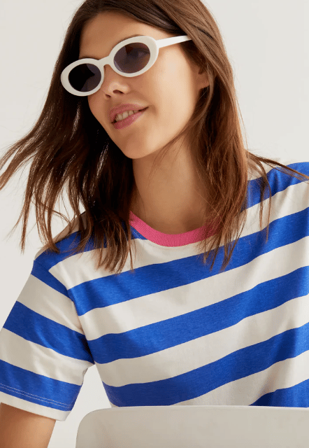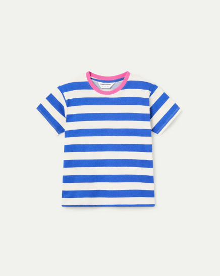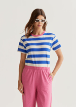 100% cotton T-shirt with a blue and white striped print. Pink crew neck and short sleeves. The model is 177 cm tall and wears size S.