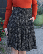 This skirt has great movement with faux snaps down the front and a hem that lands just above the knee and has pockets.