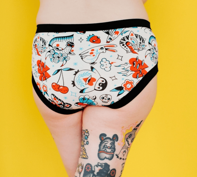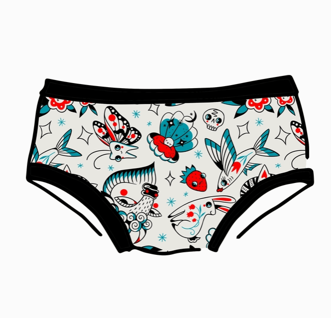 The hipster is designed to sit in the natural crease at the top of the leg, cover your bum, and reach to your high hip area. We recommend the hipster if you are flat in the tummy and/or short in the rise to the waist. For many of us, the hipster does not reach over the apex of our tummy roll at which point the natural laws of gravity take over and the hipster will roll down. In this situation we have a solution in the higher waisted, original option. Thunderpants fabric is 90% organically grown fair trade cotton and 10% spandex to give it that super comfy soft stretchy feel. The waist and leg bands are constructed in the same fabric as the body eliminating the need for the addition of grippy elastic. All garments are made locally made in Portland, Oregon.