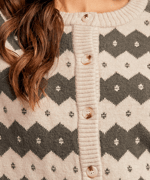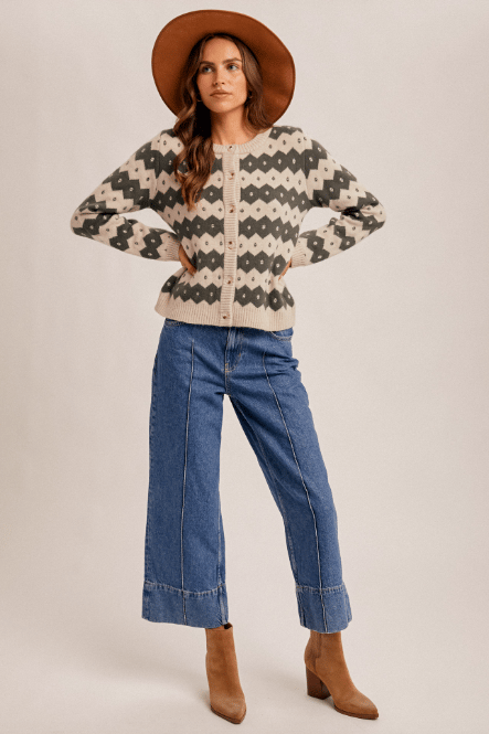 We love this crew neck diamond pattern print, crop cardigan! Perfect for living in the PNW, we can never have too many sweaters.