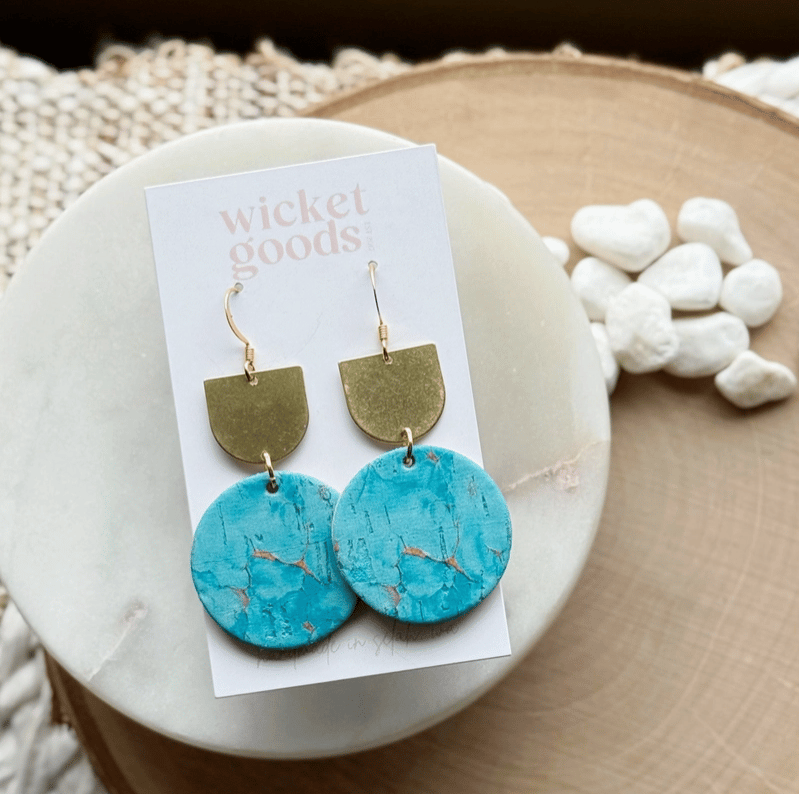 Made from cork backed with genuine leather, raw brass, and hypoallergenic gold plated brass ear wires. Designed, cut, and assembled in our home studio in Selah, Washington.