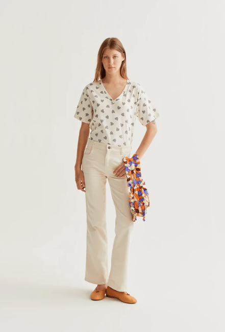100% cotton T-shirt with a black ladybug print. V-neck and short sleeves. The model is 177 cm tall and wears size S.